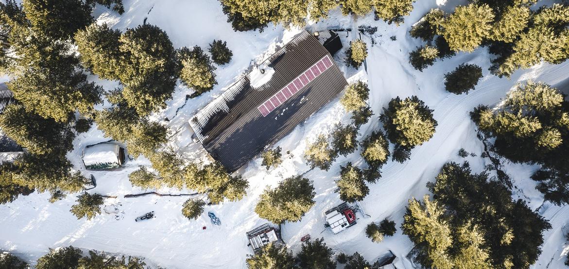 For cat-skiing we base ourselves at Hotel Grand Gjeravica (1,750m), a remote lodge surrounded by peaks and endless skiable terrain. It’s the closest you can sleep to the snow, with the mountains literally outside the door. The hotel is modest, family-run, warm, and functional, offering the essentials after long days in deep winter: a bed, hot meals, and a fire to gather around.