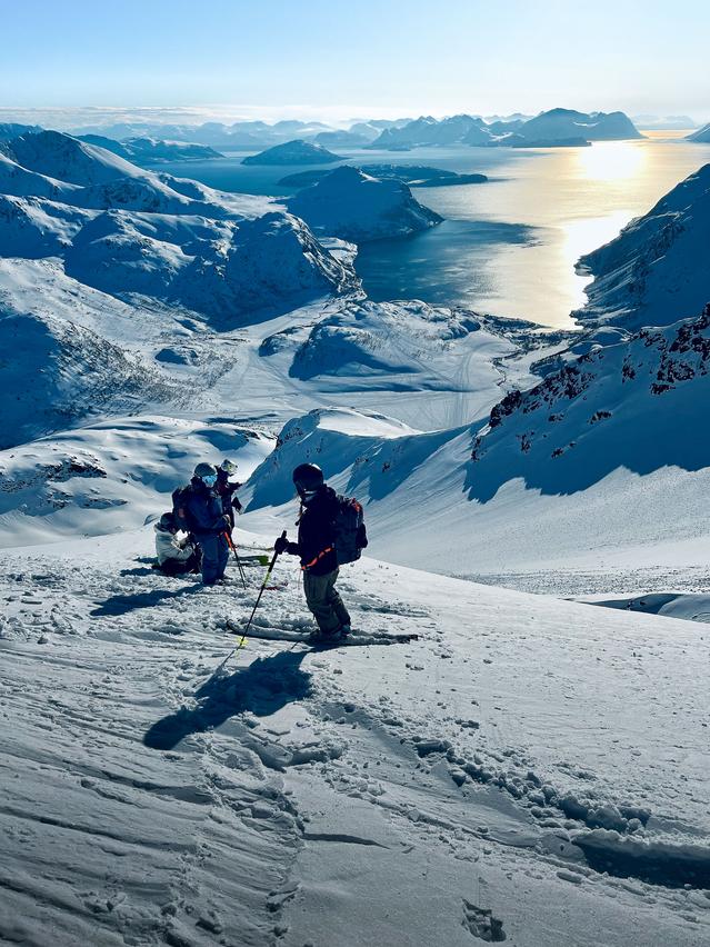 For expert-level participants, alternative objectives may include iconic steep lines and couloirs such as Forhorlttinden (“The Godmother of all couloirs”), Sofiatinden, Trolvastinden, or a full crossing of the Lyngen Peninsula with a descent around Storgalten. These lines typically range between 40–45 degrees. Safety always comes first, and conservative alternatives are chosen if conditions are not suitable.