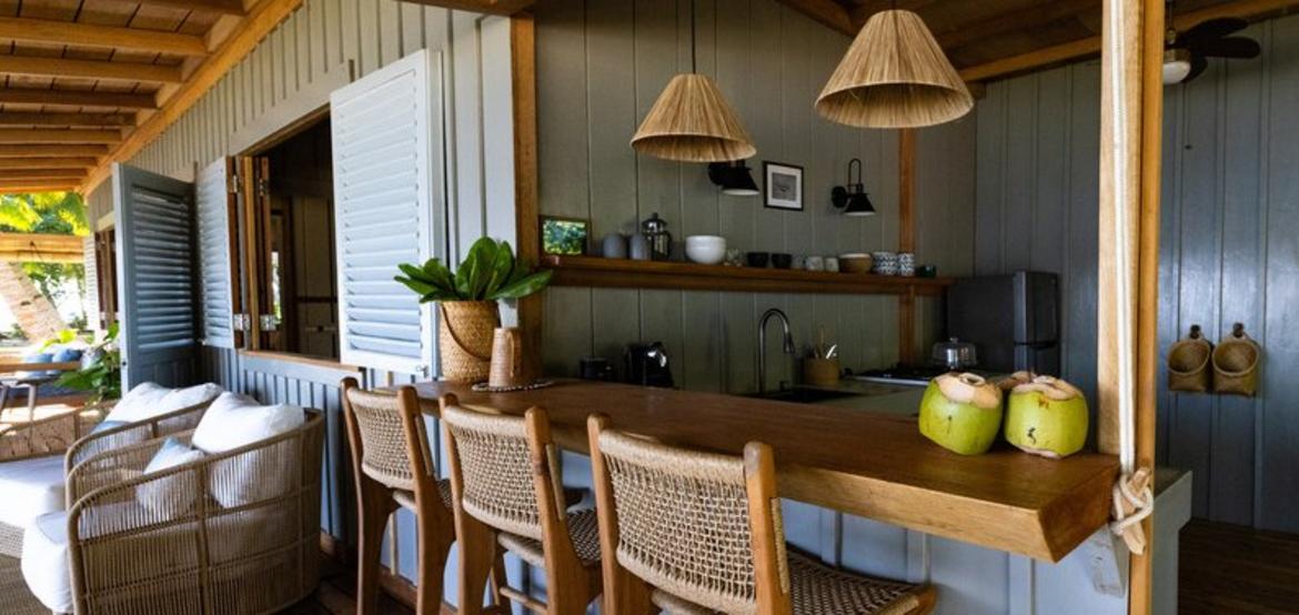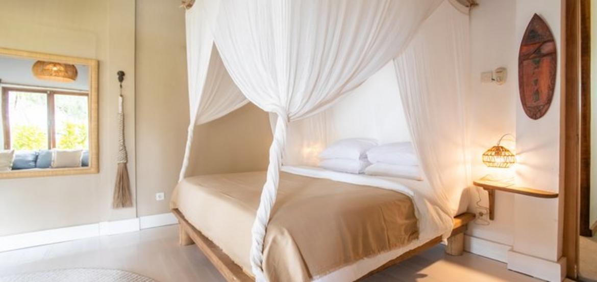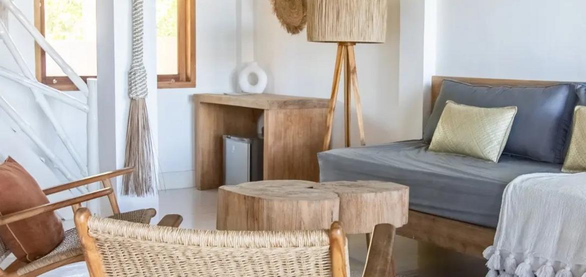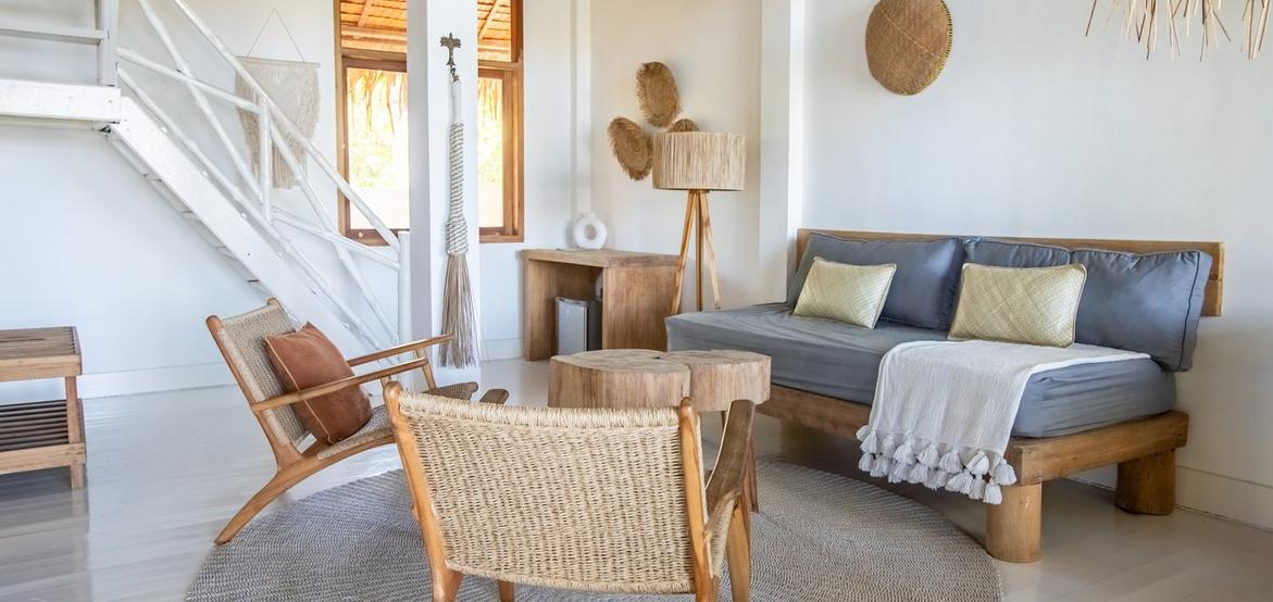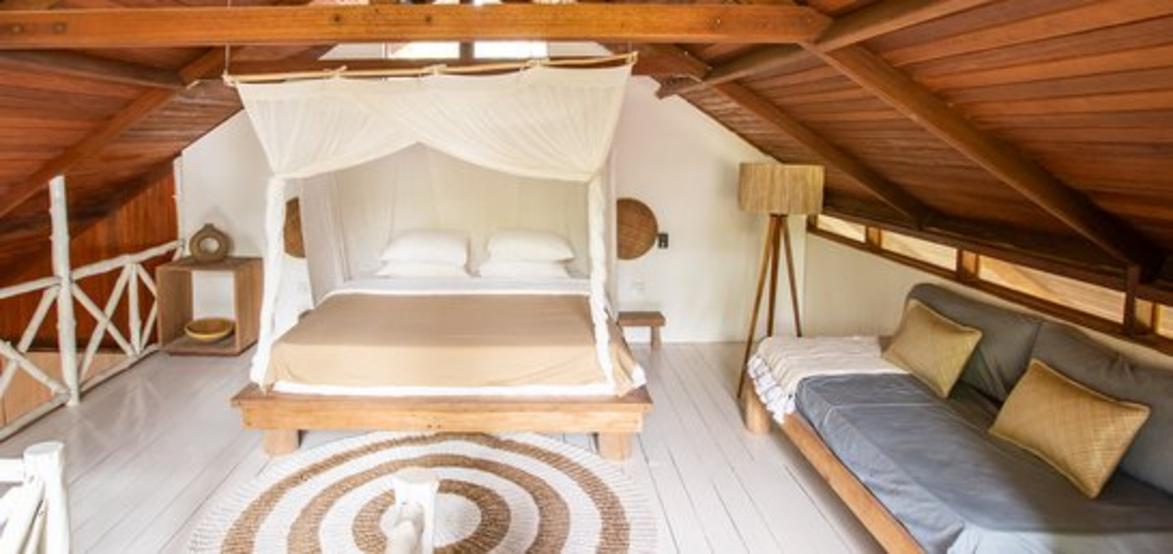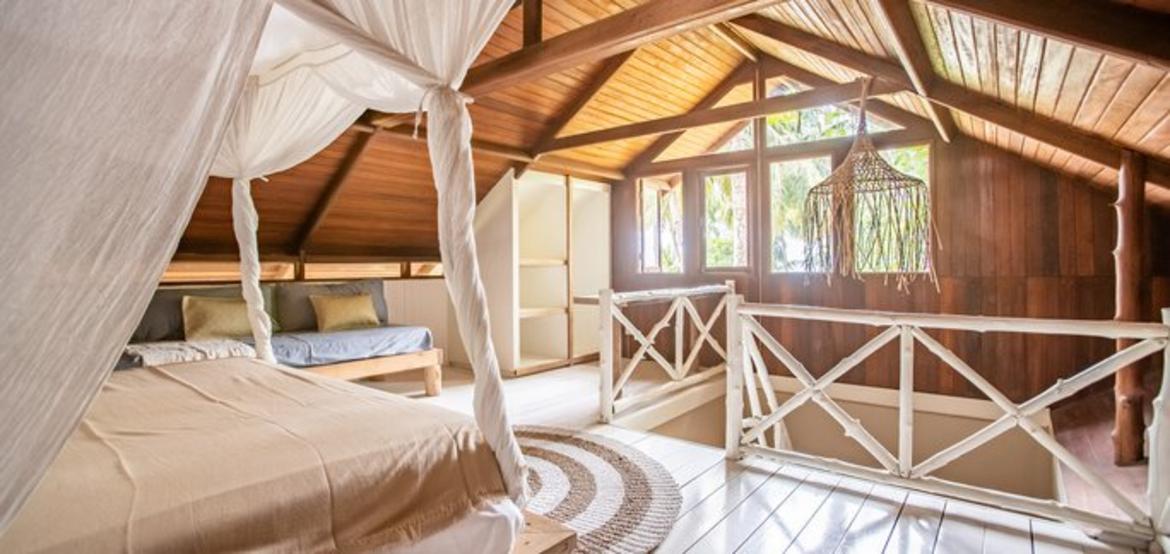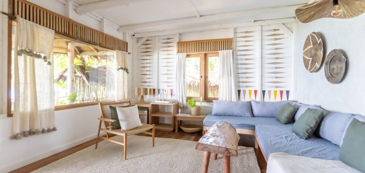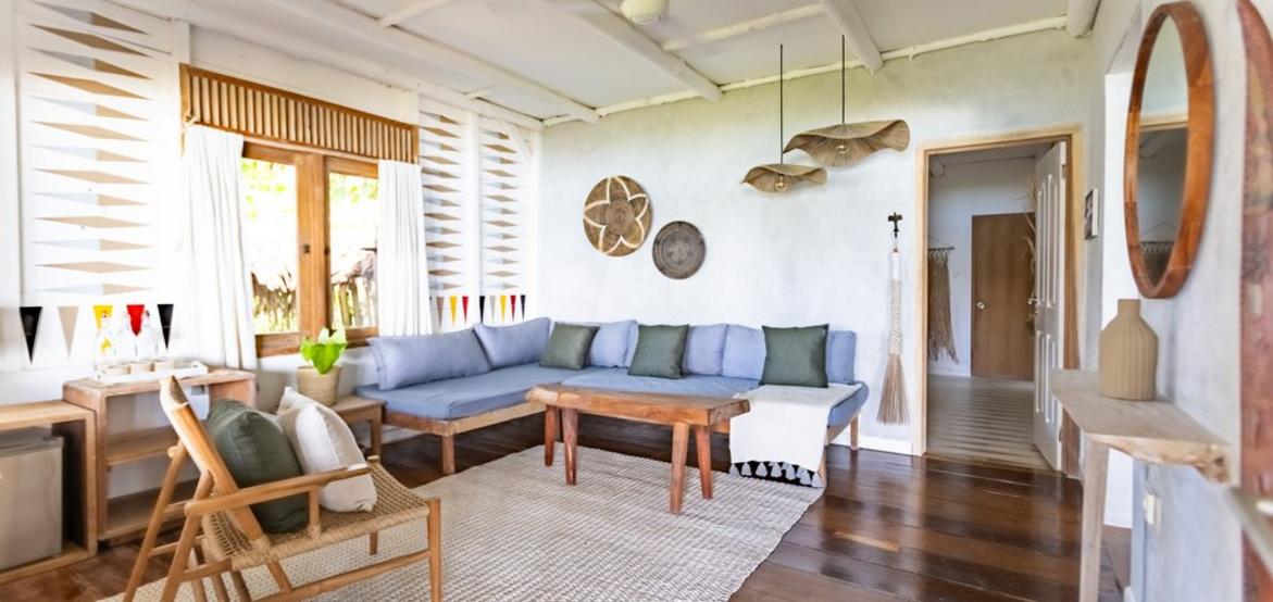 Perched above the ocean and surrounded by lush palm trees, Villa Simagere is our largest and most versatile accommodation—ideal for large families or groups of up to 8 guests. This spacious three-bedroom villa is made up of two connected units, joined by a grand outdoor terrace with a hanging bed, perfect for relaxing in nature’s embrace. Located close to the lounge and beach hut, it offers the perfect balance of privacy and accessibility.