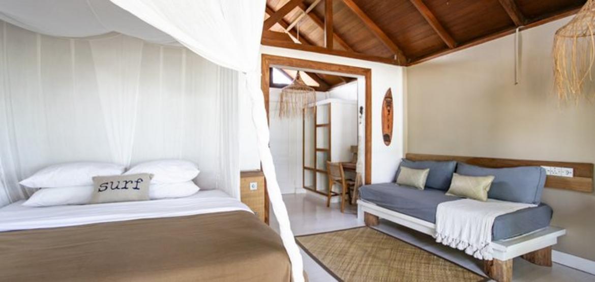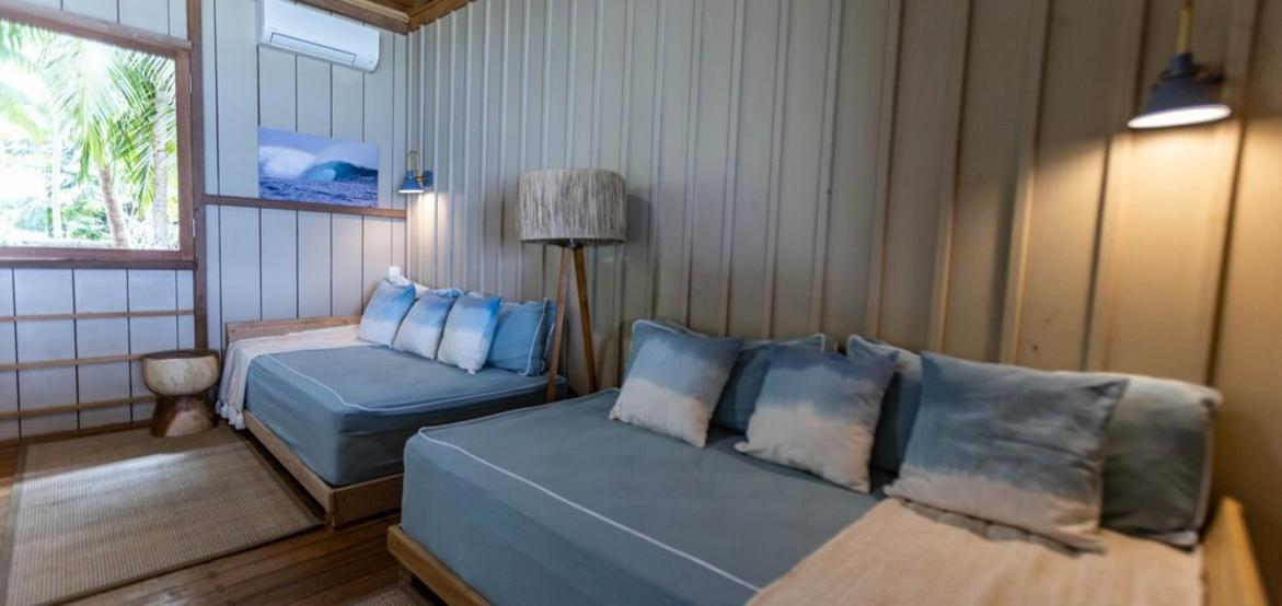 One unit features a large bedroom, cozy study, sofa bed, and en suite bathroom, while the second includes a kid-friendly bunk room, a gallery bedroom upstairs, and two bathrooms. With flexible bedding options and room for extra guests, Villa Simagere offers space, comfort, and tranquility for an unforgettable Mentawai getaway.
