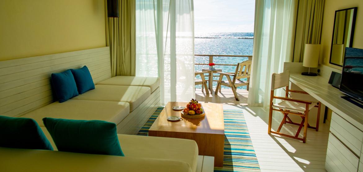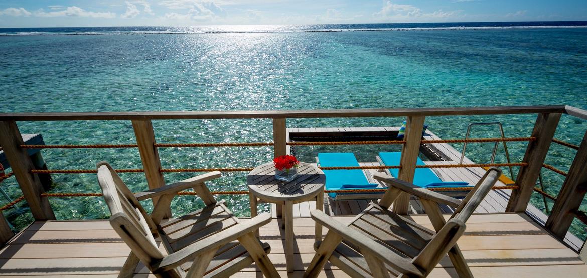 Escape to our Overwater Villa Island View—85 sqm of stylish comfort with panoramic lagoon and island views. Enjoy direct sea access, a private sundeck with lounge chairs, and a hammock over the water. Inside, relax in a king-size bed and unwind in a spa-style bathroom with soaking tub and rainfall shower. A tranquil retreat where luxury meets nature.
