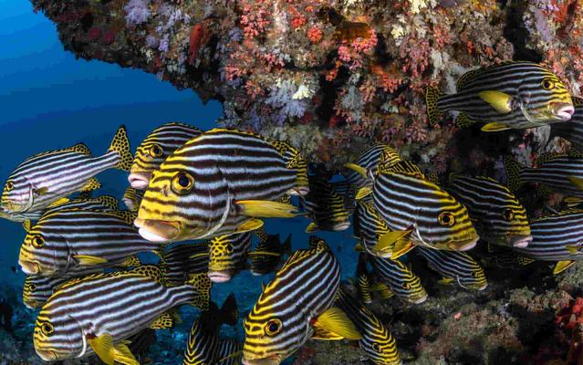 Explore Thilas (underwater mountains) teeming with colorful coral and schools of sweetlips, bannerfish, and fusiliers. Drift through Kandus (channels) and spot sharks, rays, and tunas—or if you’re lucky, a majestic manta, sailfish, or even a whale shark.