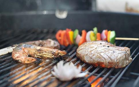 Choose from fresh tuna, lamb cutlets, chicken breast, tender prime beef, mixed skewers, and a variety of veggies.