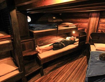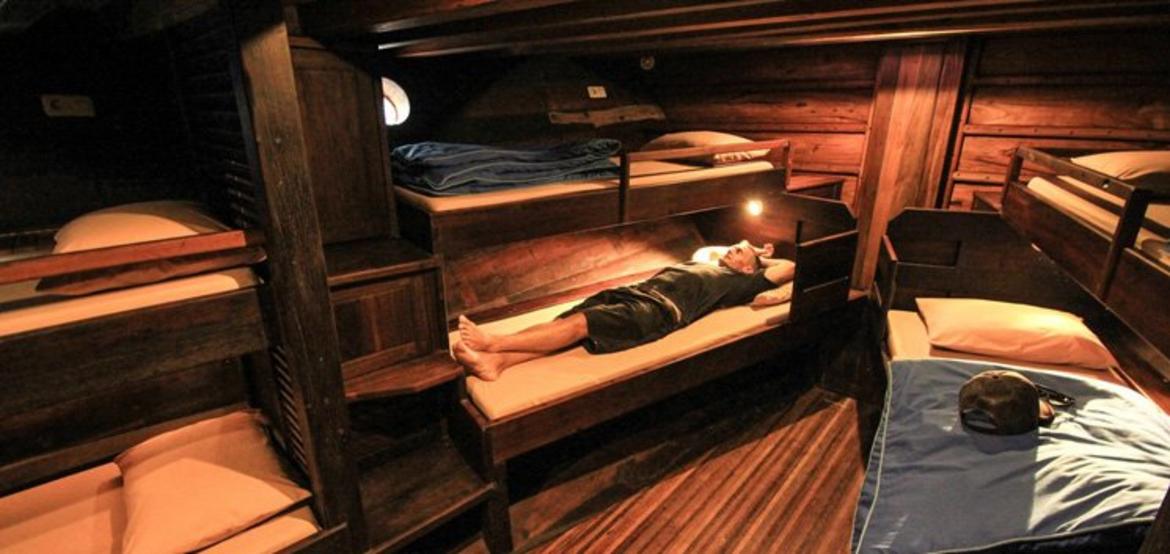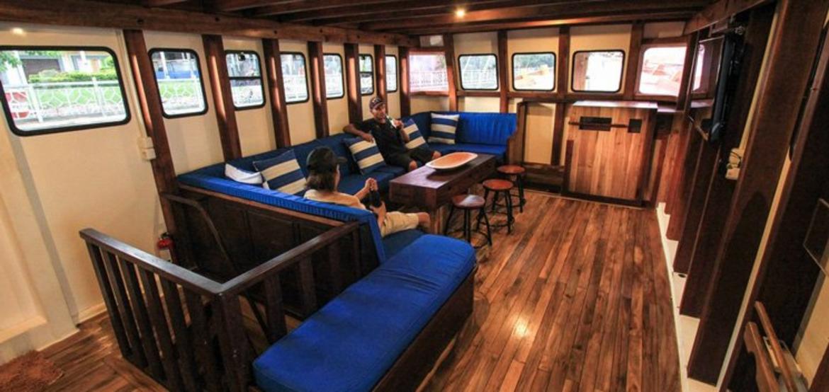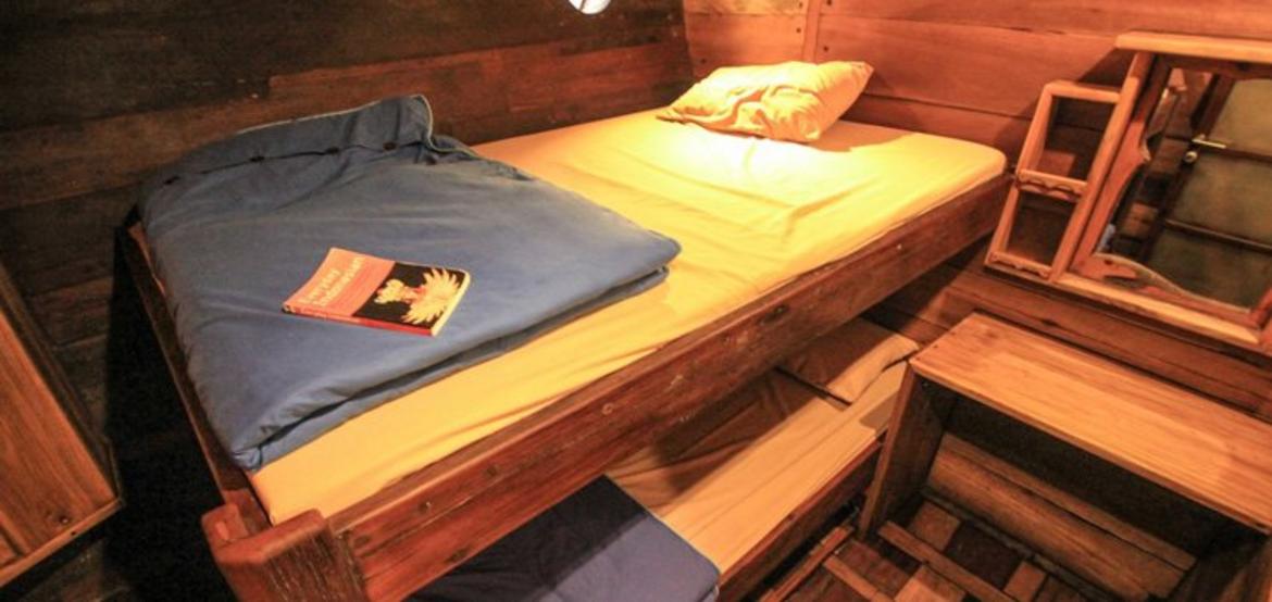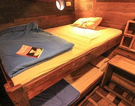 You’ll stay on a brand new boat with state of the art technology, chill out areas, and a choice of dorm or VIP cabins. With timber frames, you’ll be the envy of other surfers in one of the prettiest boats in the area. Her construction is inspired by traditional Indonesian craftsmanship of sailboats and woodworking. On board you'll find a shaded chill area and saloon not only providing A/C but featuring bluetooth sound system and TV station to hang out in the evening or during bad weather. Choose between 8 dorm bunks or the double VIP cabin.