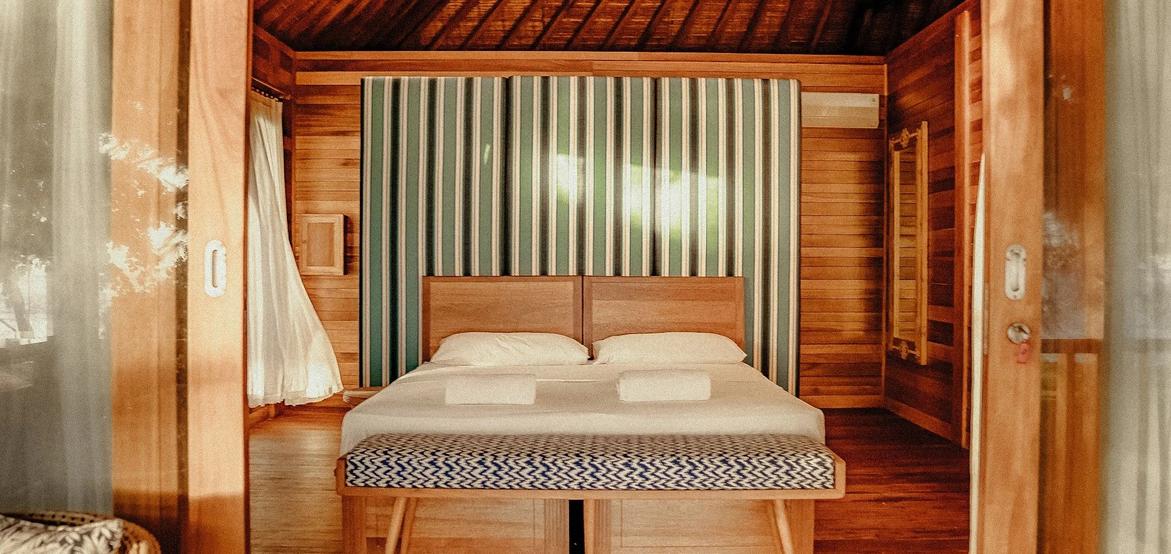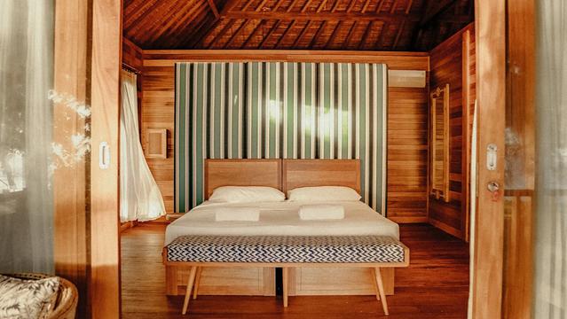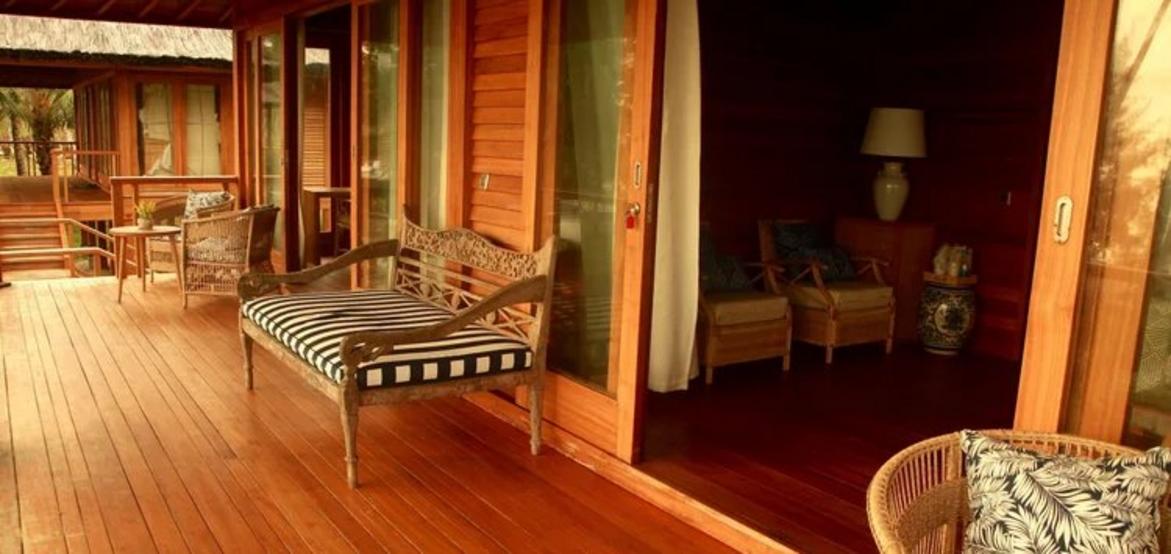 Positioned beside the beachfront infinity pool and bar, the two deluxe villas face open ocean and sunset. Architect-designed (Sumba) with insulated roofs and elevated ceilings, they add comfort perks like air-conditioning and the same 8×3 m covered balcony for long golden hours. Linen and accessories are sourced from Java, and outlooks take in the reef and evening color.