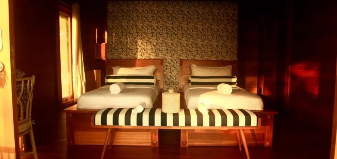 The Deluxe “Mimpi” sleeps four in a king plus two king singles (separated by a dividing wall). Features an alfresco bathroom with western toilet, shower, and a large 4-person bathtub, plus a separate living area for post-surf lounging.
