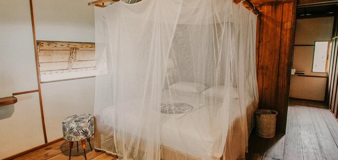 Inside each villa there is three separate bedrooms, each with a queen four-poster bed (mosquito net, ceiling fans).